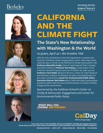 With the US’s commitment to the Paris Agreement in question and the future of federal climate change policy unclear, what steps should California take to remain at the forefront of climate action policy? Join Professor Meredith Fowlie (Class of 1935 Endowed Chair in Energy Associate Professor), Professor Sol Hsiang (co-lead author of the American Climate Prospectus and one of Forbes’s 30 under 30) and Professor Carol Zabin (Research Director, Center for Labor Research and Education, Institute for Research on Labor and Employment) in a discussion moderated by Center for Environmental Public Policy Executive Director Ned Helme about California’s policy options given potential conflicts with the new US administration on issues of climate change and the environment.