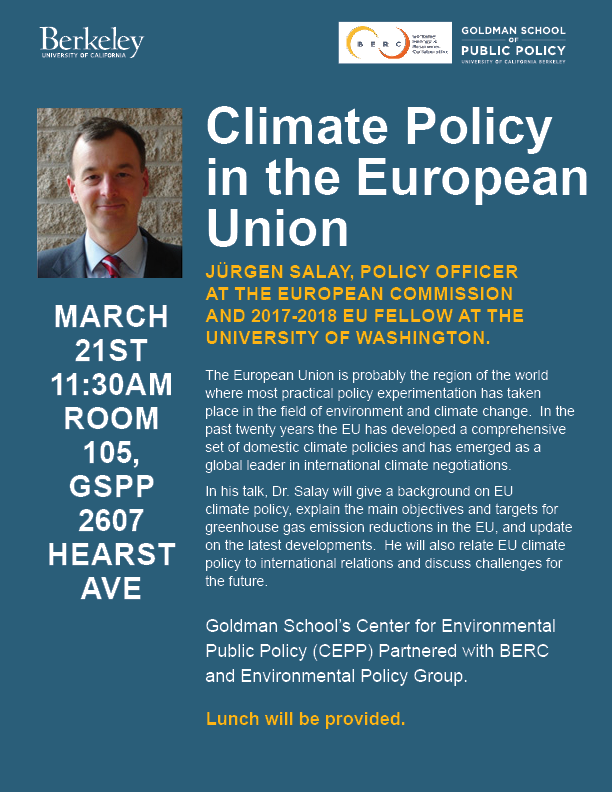On April 12th, BERC and the Center for Environmental Public Policy (CEPP) at the Goldman School hosted climate negotiators Artur Runge-Metzger and Alexa Kleysteuber along with faculty, students and members of the Berkeley community to discuss how the promises of the Paris Climate Agreement are being carried out today by Europe and Latin America.