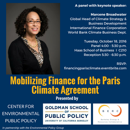 On October 18th BERC and the Center for Environmental Public Policy (CEPP) at the Goldman School hosted an engaging, provocative panel exploring the financial details of this immense undertaking. Over 50 students, faculty, and members of the Berkeley community attended this BERCShop on “Mobilizing Finance for the Paris Climate Agreement.” ---Read more here---