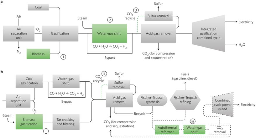 a,b, Simplified flow diagram for IGCC-CCS (a) and polygeneration-CCS (b) processes for production of electricity and fuels from coal and biomass. Green boxes and dashed green lines indicate options to decrease the carbon intensity of resulting fuel or electricity products. Dashed lines indicate optional process enhancements. Options to decrease the carbon intensity of products in IGCC-CCS systems include (1) increasing the ratio of biomass to coal inputs, (2) increasing the shift of syngas in the water–gas shift reactor, and (3) recycling CO2 from the sulfur removal process to the acid gas removal system. For polygeneration-CCS, options include (i) increasing the ratio of biomass to coal inputs, (ii) recycling CO2 from the sulfur removal process to the acid gas removal system, and (iii) autothermal reforming and shift prior to electricity production.