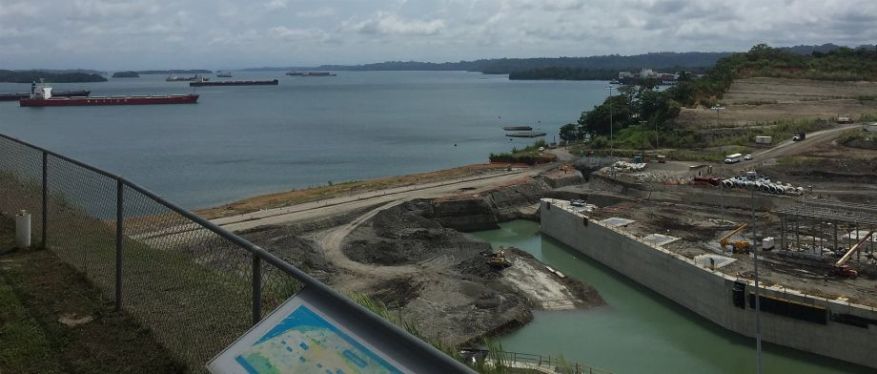 The widened Gatun Locks (foreground) on the Atlantic side of the Panama Canal (seen behind) are still under construction, with completion anticipated next spring.
