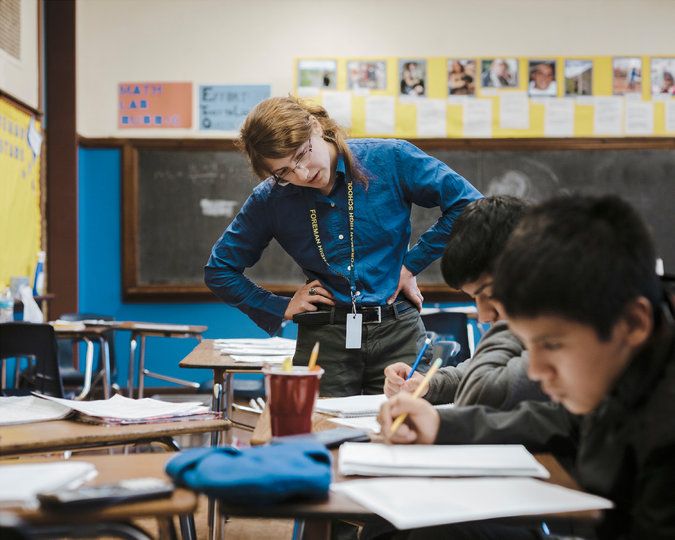 At Edwin G. Foreman High School on Thursday, Avery Huberts watched as Christophir Rangel and Iann Trigveros worked on a math problem.