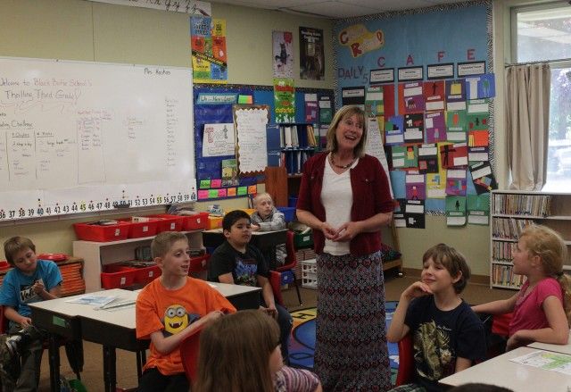 Third grade teacher Lynn Haskins talks to students at a school in Shingletown, California, on May 25, 2016.