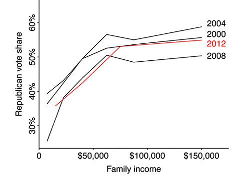 Remarkably, this same pattern has occurred in every presidential contest over the past twenty years. Lower-income voters consistently support the Democratic candidate in nearly every state. Upper-income voters, on the other hand, are more mixed in their political views: wealthy voters in Mississippi are strongly Republican while wealthy voters in Massachusetts are strongly Democratic. Extensive analyses of survey information from these elections show that this relationship holds even when controlling for age, race, sex and education.