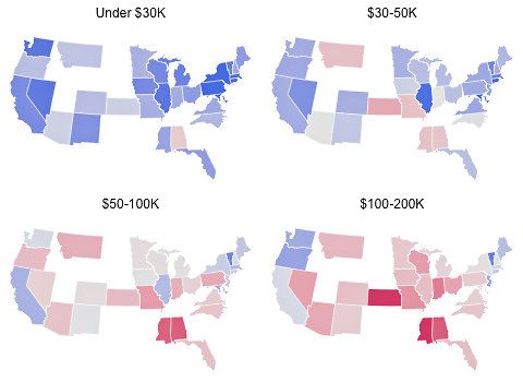 The maps in fig. 2 show the election results for four income groups as measured by exit polls (with blanks for the states that were not polled):