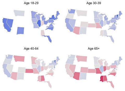 We can break down the electorate by age similarly. Among young voters, Obama won a sizable 60 percent of the vote, with a solid majority in nearly all states included in the exit polls. In contrast, Romney won a solid 56 percent among senior citizens, with a strong showing in the red states (including two-thirds of elderly Arizonans), but with a sizable majority supporting the president in blue states like New York and Massachusetts.