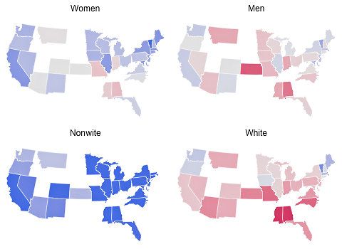 Similar patterns show up if you break up the state-by-state vote by sex or race.