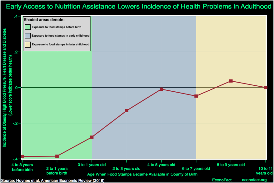 - But, there is also evidence that the benefits of nutrition support can persist well into adulthood for those who have access to the program before birth and during early childhood. The roots of today's SNAP program originated with a food stamp pilot in 1961 and expanded gradually on a county-by-county basis until 1975, when all U.S. counties had a food stamp program in place. (The food stamp program was renamed SNAP in the 2008 Farm Bill, see here for a history of the program.) Since the program was introduced on a county-by-county basis over 50 years ago, it is possible to observe adult health and other outcomes of comparable individuals who differ in the age at which Food Stamps became available, depending on their county of birth. Doing this comparison, our research finds that having access to nutrition support before birth and in early childhood leads to a significant reduction in the incidence of obesity, high blood pressure, heart disease and diabetes in adulthood (see chart). The largest effect was for those children who were born after the Food Stamp Program had been implemented in their county of birth. Their mothers had access to the program during pregnancy, and it continued to be available throughout their entire childhood. In contrast, there was no reduction in the incidence of these metabolic diseases for children who were in the later stages of childhood when the Food Stamp Program was implemented in their county. In addition to the health effects, women with access to the program as children were also more likely to graduate from high school, earn more, and rely less on the social safety net as adults than those who did not.