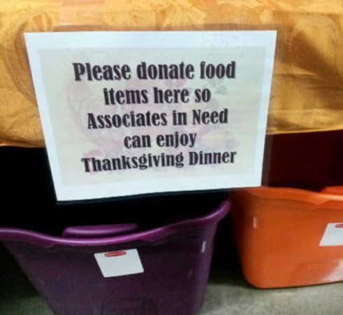 “Please donate food items here so Associates in Need can enjoy Thanksgiving Dinner.”
