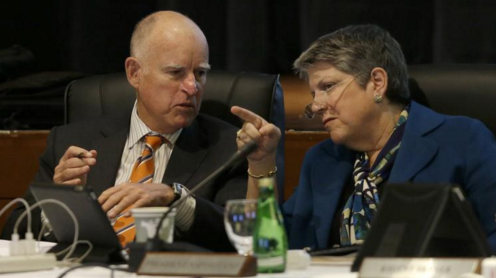 Gov. Jerry Brown talks with University of California president Janet Napolitano during a UC Board of Regents meeting in San Francisco on March 18. (Jeff Chiu / Associated Press)