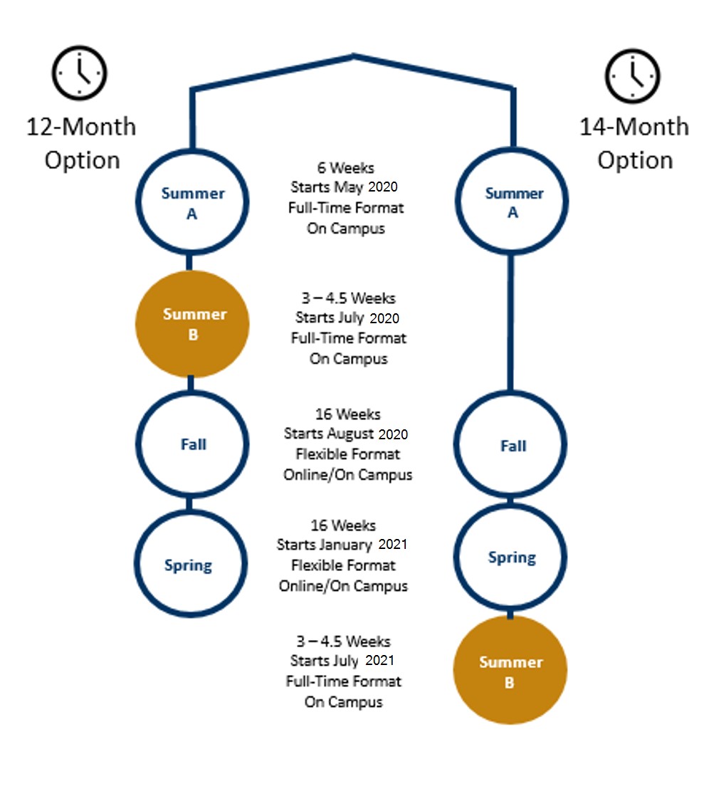 By spreading the summer requirements over two summers, students can choose an alternate schedule that integrates with commitments outside of school such as full-time work or family obligations. Students who choose this option will increase their time to graduation from 12 to 14 months.