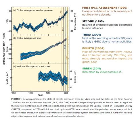 A summary of the Intergovernmental Panel on Climate Change’s findings from the First Assessment Report (1990) to the latest report is presented in Figure 1. This graphic is specifically not about the scientific record alone. What is most important about this figure is the juxtaposition of the language of science and the language of … language.