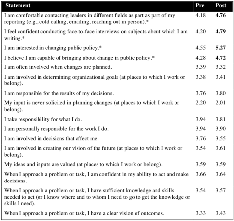 Post-course, more MOOC participants rated their expertise in child welfare, public policy and journalism as intermediate and expert than they had pre-course. As a result of JSC4, students were more comfortable contacting leaders and conducting interviews (see Figure 1). Most importantly, they were more interested in changing public policy and more likely to believe that they could change public policy.