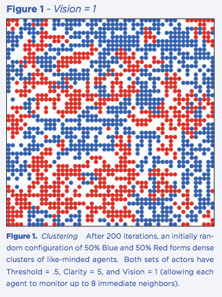 What is surely changing is the ability of ordinary citizens to monitor an ever-increasing share of opinions in the population at large. In a forthcoming paper in Psychological Review, I propose and test a mathematical model of social influence based on the notion that people tend to resist social pressure until a critical level of opposition is encountered. This critical threshold constitutes one key parameter of the model. A second key parameter is norm clarity; it measures the degree to which members of a faction share the same threshold. When clarity is very high, the model predicts the kind of stark “tipping points” explored by Thomas Schelling (in his analysis of racial segregation in housing) and popularized in the writings of Malcolm Gladwell. But the model also explains why such dramatic discontinuities are far from ubiquitous; when clarity is sufficiently low, any changes will be gradual rather than sudden. My paper offers a wide variety of tests of the model using classic data sets on conformity, deliberation, the diffusion of innovations, and social movements, as well as checks to verify that the model finds thresholds where it should and not where it shouldn’t. The model can be used as a tool to estimate these parameters in real-life situations. But it can also be used to explore social scenarios that would be nearly impossible to test in social psychology experiments. Some of my initial simulations use an approach called agent-based modeling, in which large numbers of simulated agents simultaneously react to the distribution of opinion in their neighborhood in accordance with the threshold model. After they react, the social situation has changed, and so they each react again, sometimes but not always reaching a stable equilibrium. In these simulations, I have found that the threshold and clarity parameters produce qualitatively different behavior as I vary a third parameter called vision.