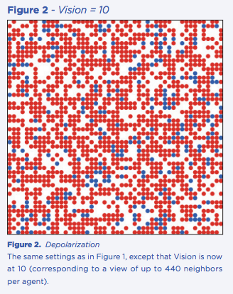 Vision refers to the number of neighbors whose opinions each agent is able to monitor. I believe that the vision parameter is quite important because we are seeing a dramatic shift in our ability to monitor the views of an ever-increasing share of the national (and ultimately global) population. How? Through an endless barrage of highly publicized public opinion polls, user recommendations on Amazon.com and other commercial sites, “likes” on Facebook and YouTube, and rants in blogs and Twitter posts.