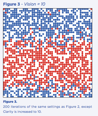 Finally, Figure 3 shows that at the same level of Vision, increasing Clarity dramatically amplifies clustering. This example is more like the first one, with sustained polarization, but now the clusters are very large — an image reminiscent of the regional differences in “Red and Blue” maps of the American electorate.
